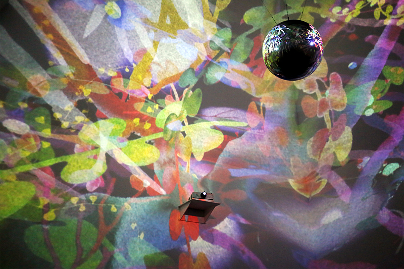 プロジェクターからの映像が鏡面の球体に反射して、暗い展示室の全体に投影。室内にはクッションがあり、座って見ることができます。
