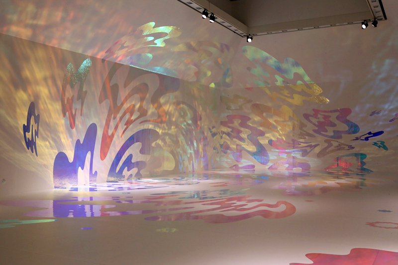 対照的に展示室全体が明るい光に包まれているのは、第5室の《鳴る光》。光が発する音の波紋を表現した作品で、偏光フィルムを用いて、音を調律するように光と色を操っています。