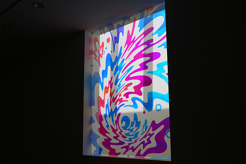 展示室は上部が窄まった形で、ゆっくりと色と形が変わっていく映像を見上げていると、まるで色彩の森に包みこまれたような不思議な気分になります。