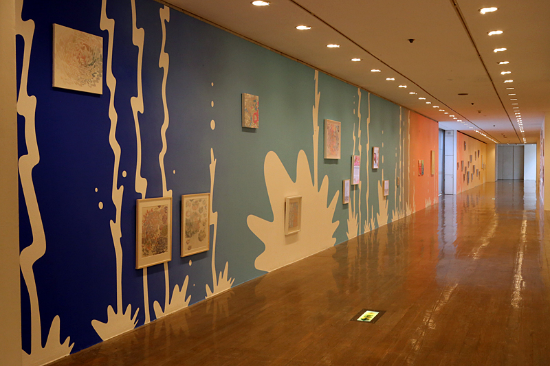 長い廊下状の第6室は、壁面をグラデーションで彩色。「水の心電図」をイメージしており、それぞれの色の面で、小作品がカテゴリごとに展示されています。