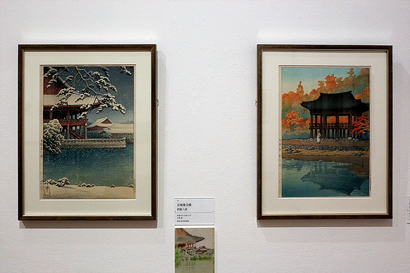 所蔵作品展「渡邊版 ─ 新版画の精華」には、川瀬巴水が影響を受けた伊東深水の《近江八景》が並ぶ