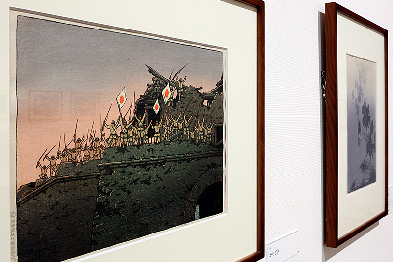 戦時中に手掛けた日本軍を題材にした版画や、海外向けの月刊誌など。最期の作品は《平泉金色堂》