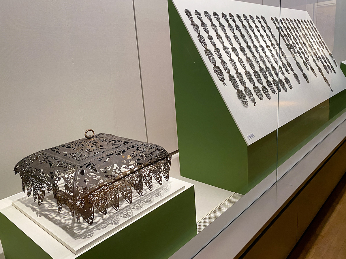 国宝《灌頂幡》は、天蓋がついた豪華な幡。幡(ばん)は仏教の儀式で用いる旗で、現存する他の幡が全て織物製なのに対し、こちらは金銅製の透彫。文字資料を含めて他に類例がありません。天上から舞い降りる菩薩の姿が表現されています。