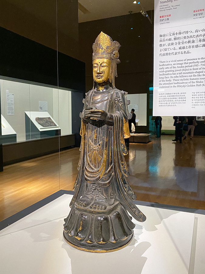 威厳と存在感に満ちた重要文化財《菩薩立像》は、飛鳥時代前期を代表する名品。山形の高い宝冠、面長の顔、魚のヒレのように広がった衣の表現など、金堂釈迦三尊像の両脇侍と似ています。