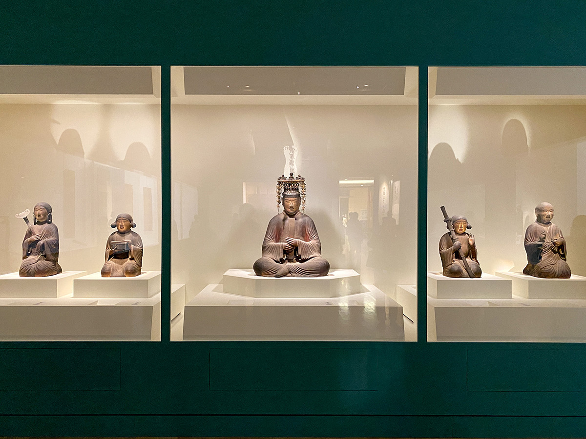 国宝《聖徳太子および侍者像》は聖徳太子の500年遠忌に制作された、法隆寺聖霊院の本尊。通常では拝観できない秘仏です。聖徳太子の威厳に満ちた姿とは対照的に、周囲の侍者はユーモラスな表情です。