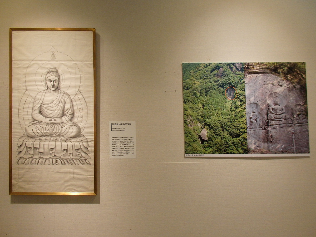 阿弥陀如来像 下絵 1965年 京都府立堂本印象美術館蔵(左)と下絵をもとに制作された磨崖仏(右パネル)