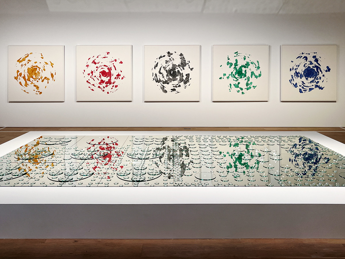 会場の冒頭は、ヴォルフガング・ライプの作品から。黄色い粉は、ライプが住むドイツ南部の小さな村で集められた、ヘーゼルナッツなどの花粉です。