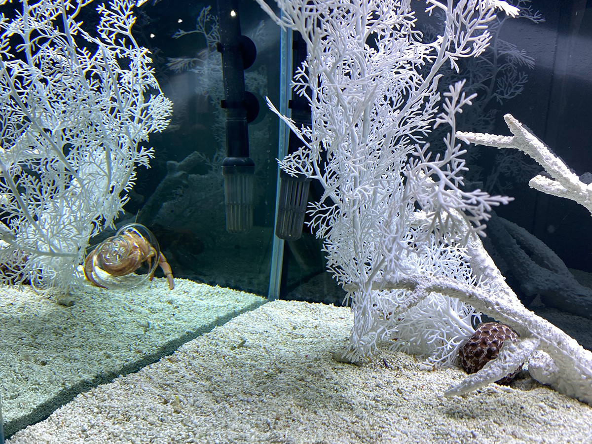 このゾーンでは、生体展示としてヤドカリとグラスキャット、グラスフィッシュなどが展示されています。ヤドカリは貝殻の代わりに透明なケースを背負っているので、普段は貝殻に隠れる部分がよく見えます。