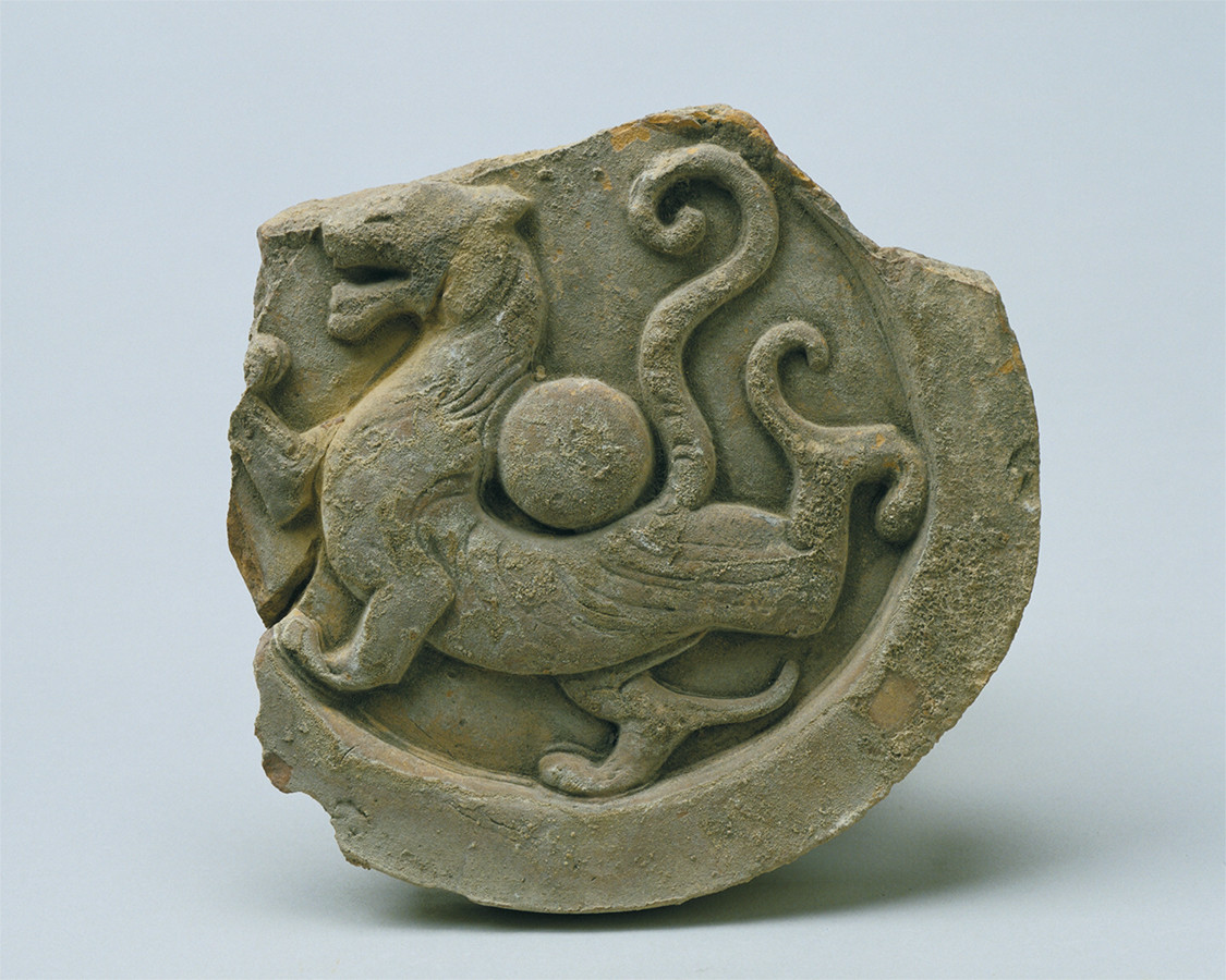 中国で前漢時代の終わりごろ(A.D.1C初)につくられた瓦です。四神のひとつ、白虎を表現した瓦で、屋根の最前列を飾りました。他には、玄武、青龍、朱雀を表現した瓦もあります。みやこ長安では、重要な儀礼をおこなう建物の屋根に使用していたようです。
