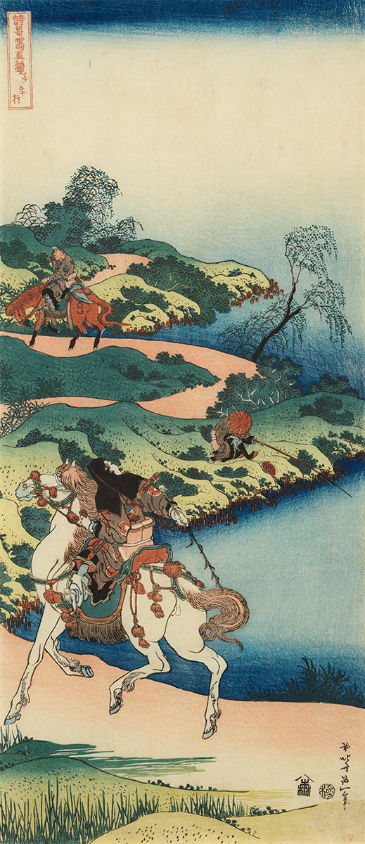詩歌写真鏡は北斎晩年の錦絵シリーズで、全10図が知られています。画題は和漢の歌にちなんだもので、本図は唐の詩人、崔国輔の詠んだ「少年行」という歌をモティーフに描いています。縦に長い判型をうまく活かし、奥に向かって蛇行する道を描くことで、見る人の視線を画面奥に誘い、白馬に乗った男性の進む導線に奥行を感じさせています。