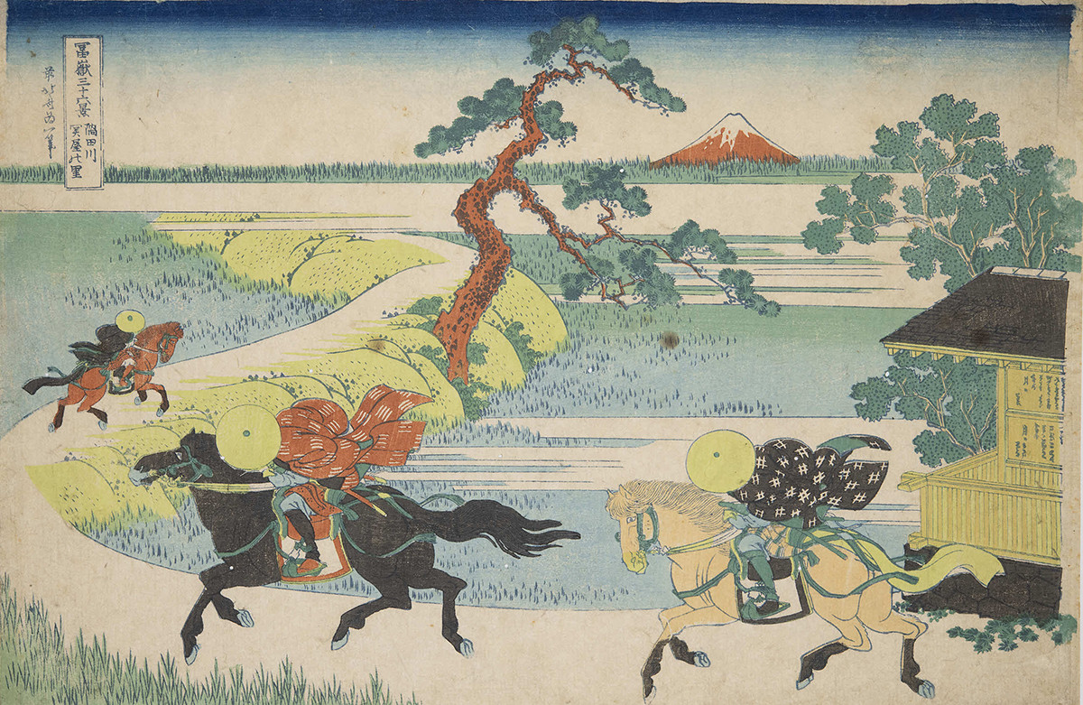 北斎の代表作「冨嶽三十六景」のうちの一図です。場所は隅田川のほとりにある村里。馬に乗った三人の武士たちが、土手の上を慌ただしく疾走しています。