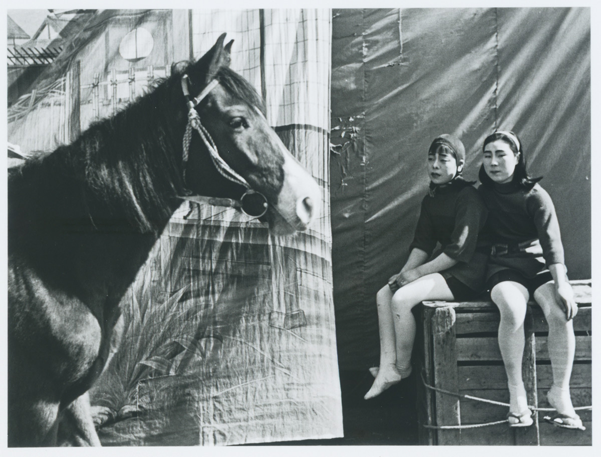 幕によって画面が二等分され、左に馬、右に二人の少女が収まるグラフィカルでな構図は、白と黒の配分が見事です。濃い目のお化粧をした少女たちの風貌も相まってユーモラスですが、放浪するサーカス団の哀愁も漂うようです。
