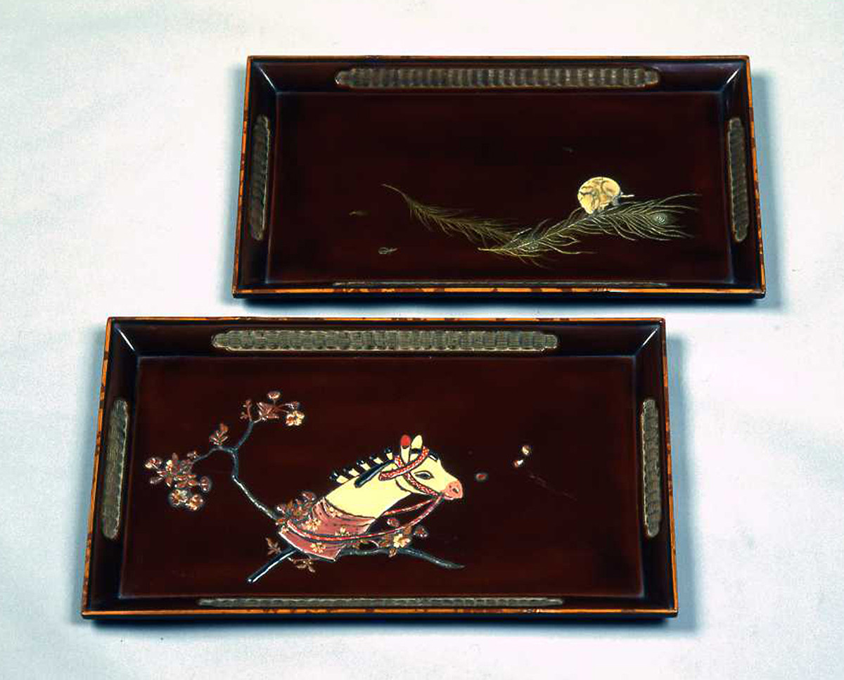 高岡市出身の漆芸家による錆絵の技法を用いて作られた作品である。吉祥文様である馬とねずみが描かれ、馬は首馬や春駒などと呼ばれ、江戸時代から親しまれた玩具がモチーフ。