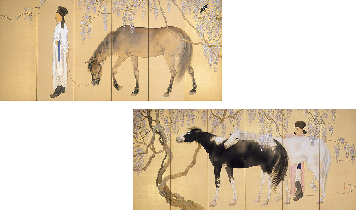 中国唐時代の詩人・杜審言の詩あたりに画題を求めたのでしょう。藤樹の下で憩う二人の人物と三頭の馬が描かれています。手綱を牽く青年は思慮に耽り、一方、鞭を持つ童子は、藤の香りに誘われ心地よさそうな二頭の馬に、愛おしい表情を浮かべています。