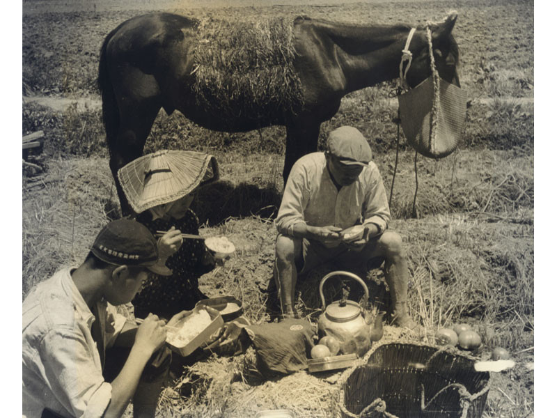 八代市出身の麦島勝(1927~2018)氏は、「日常」という視点でふるさとを撮り続けた写真家です。この写真は、八代市の金剛地区で撮影されたもの。農作業中のなにげない昼食風景です。人は弁当箱にぎっしり詰まったご飯とおかずはトマトと塩。馬は首から下げた袋に入った「飼いば」を食べています。