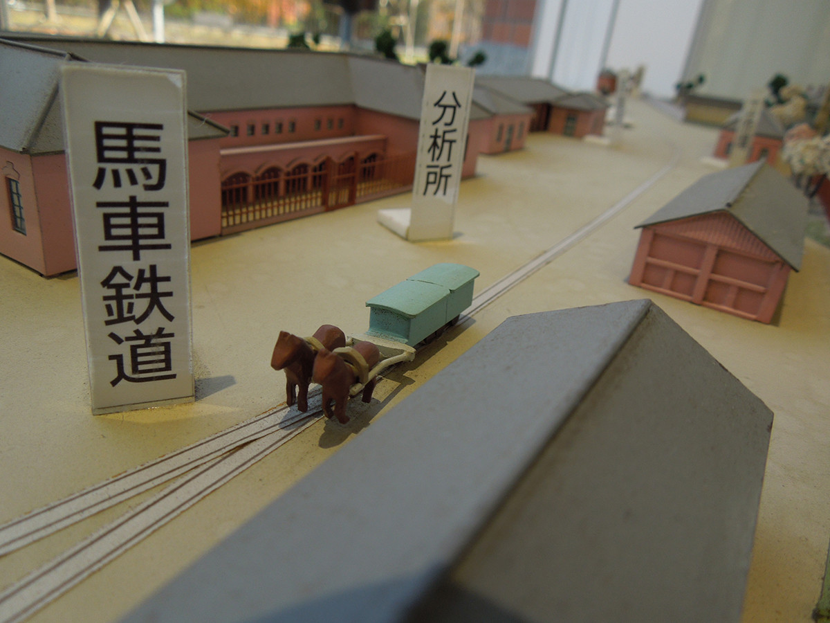 創業当時の造幣局を300分に1のサイズで再現したもので、局内にあった様々な施設に加えて、馬車鉄道が運行している様子や、専用のレールと門も見ることができます。模型の中にいる馬が全部で何頭いるか、ぜひ探しに来てください。
