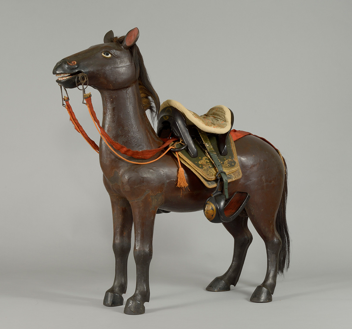 作者:不明年代:江戸時代ほのぼのとした表情をたたえたこの木馬は、上流武家の子どもの乗馬の稽古に使用されたものです。寄木造りに和紙を張り、その上から黒漆を丁寧に塗り重ねて仕上げられています。稽古に使われた道具のため、現存は少なく大変貴重です。