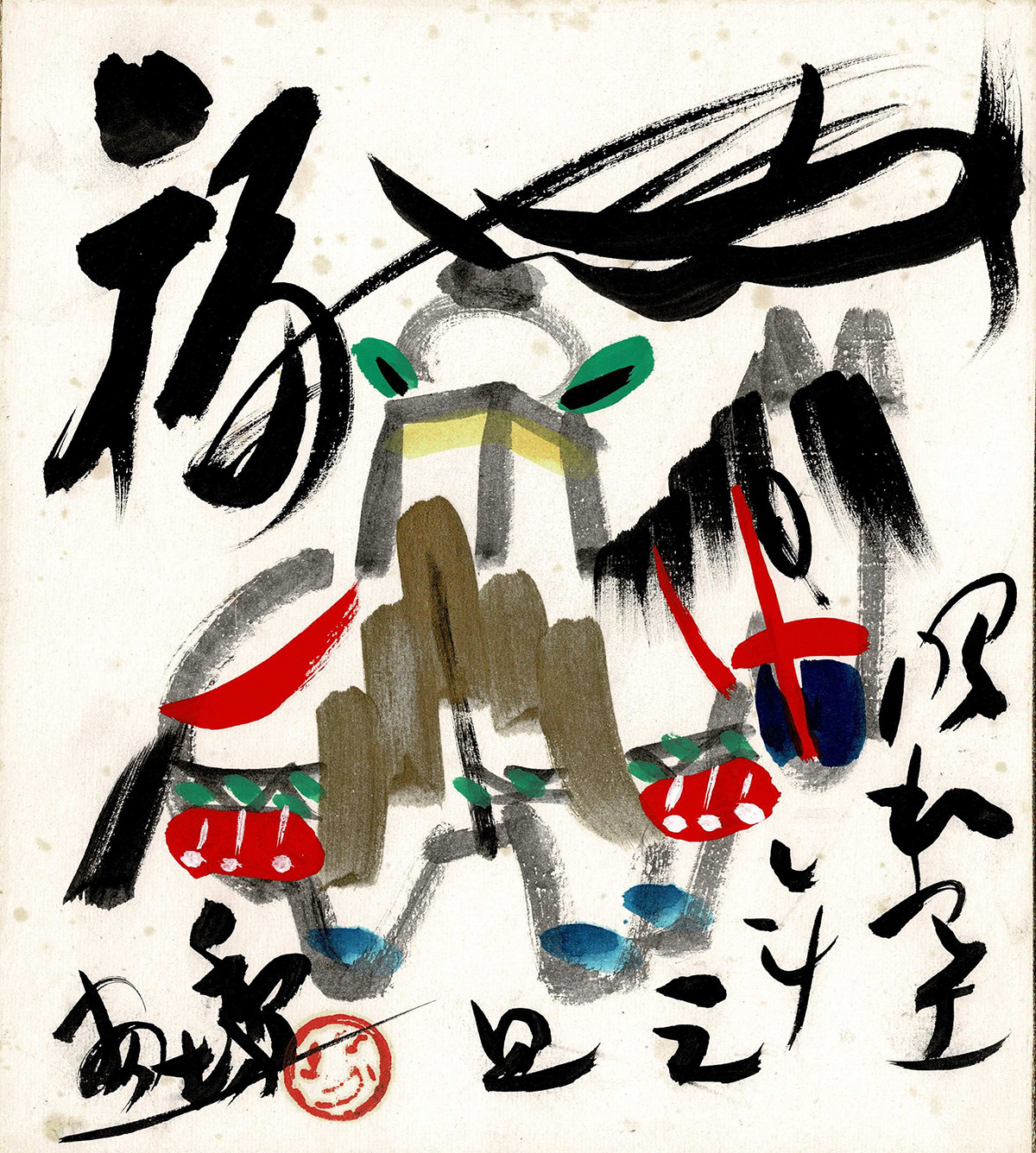 愛知県一宮市に伝わる郷土玩具「一宮のおん馬」を描いた色紙絵。邦坊は戦前の時事漫画家時代から郷土玩具に親しみ、戦後も「讃岐おもちゃの会」に参加していました。邦坊旧蔵資料のなかには同じ馬の人形はありませんでしたが近所にあった金刀比羅宮の学芸参考館には全国各地の郷土玩具コレクションがあり「一宮のおん馬」も収蔵されています。古今東西の午の玩具が揃うなか邦坊画伯と目が合ったのがこの馬の人形だったのかもしれません。さて賛は「福馬」とあります。流麗すぎる「馬」という文字ですが駿馬の疾走感を表現したような個性的な一文字です。1年の始まり、馬の瞬発力にあやかって良いスタートダッシュになりますように