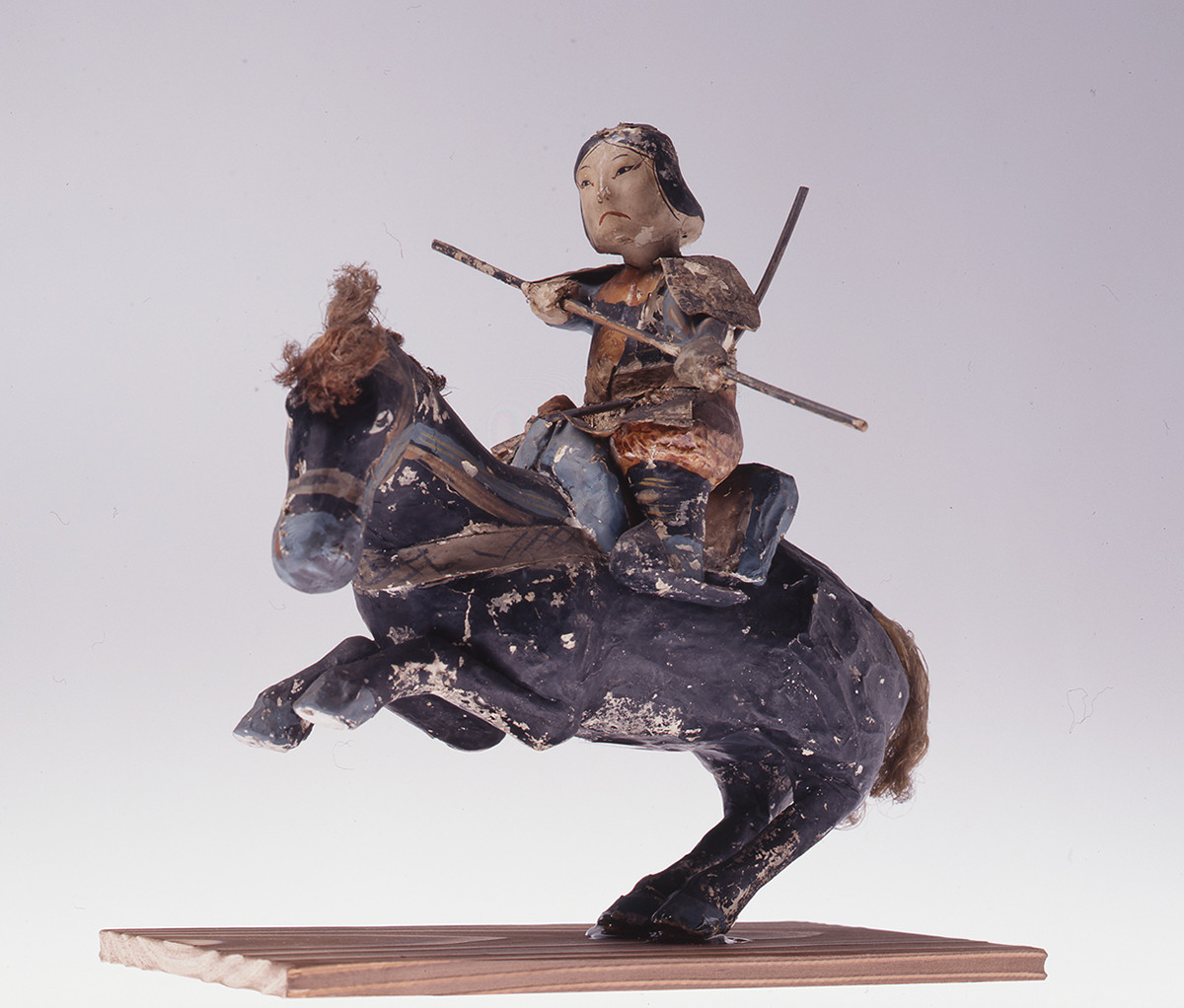 三春人形は江戸時代中期から三春藩(現福島県郡山市、田村郡三春町)で作られていた張子の人形です。この人形は、平安時代の武将、源義仲の愛妾(あいしょう)である巴御前(ともえごぜん)が馬に乗る姿をあらわします。巴御前は武勇に優れ、かつ、美しく、義仲と共に戦場で戦った女性として知られます。