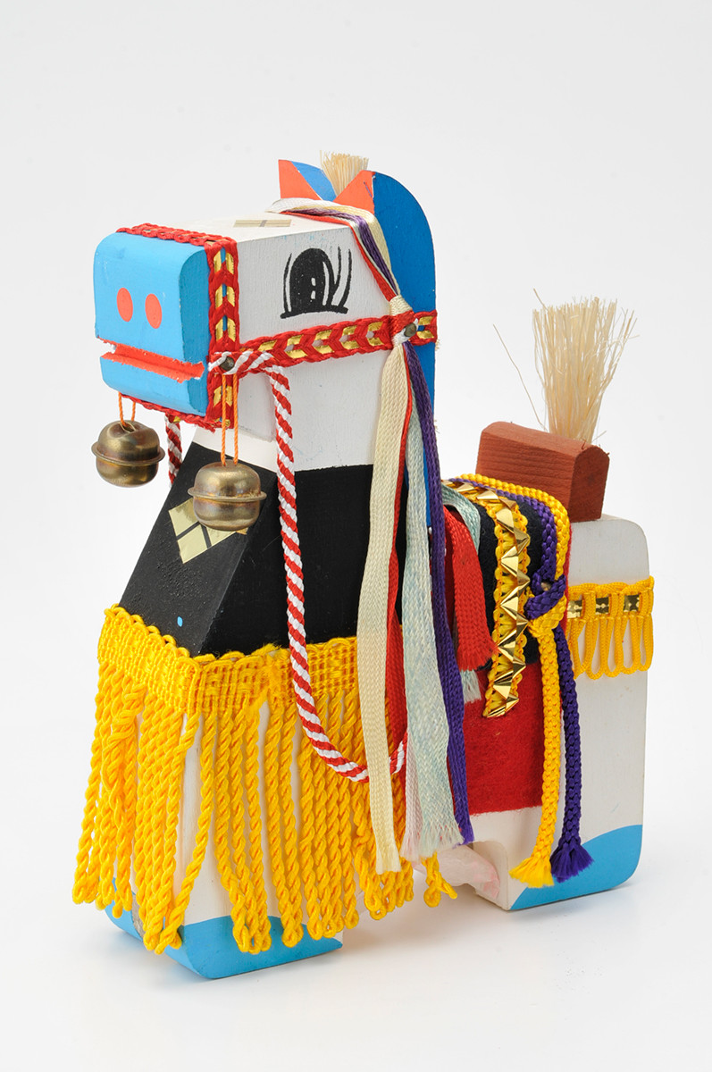 岩手県で現在まで続いている「チャグチャグ馬コ行進」をモチーフにした郷土玩具です。チャグチャグ馬コは、岩手県滝沢市の鬼越蒼前神社から盛岡八幡宮までの14キロの道のりを約5時間かけて行進するもので、農耕で活躍する馬に感謝し、年に1度飾りたてて勤労を労うことを目的に行われています。馬たちがまとう煌びやかな装束には、大小700個もの鈴がついており、歩くたびに「チャグチャグ」と鳴ることがその起源と言われています。郷土玩具でも、鈴・煌びやかな装束を纏った姿が美しく表現されています。