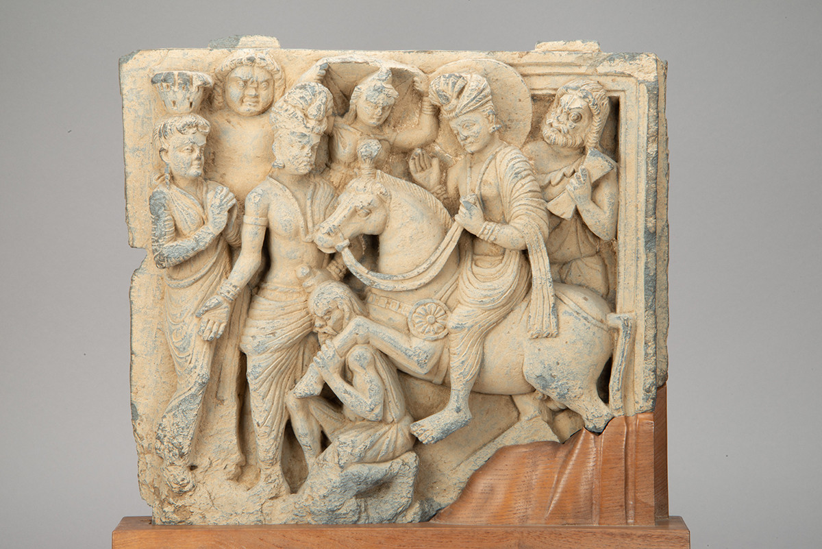 愛馬カンタカに跨がり、今まさにカピラヴァストゥ城を出て出家に向かう、シッダールタ王子をあらわした浮彫です。王子の左側、両手でショールを頭上に広げるのは、夜の女神ニュクス。シッダールタが旅立ったのが夜中であることを暗示しています。画面左端には心配そうな眼差しで王子を送り出そうとする城の守護神テュケーなど、仏教彫刻でありながらギリシア神話の神々が登場する本作は、東西文化交流がうかがえます。