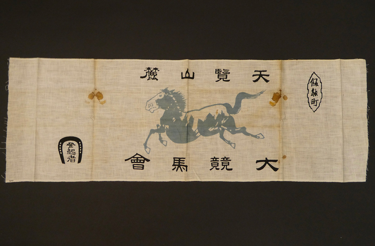 大正13(1924)年に飯能町で開催された草競馬に伴って作成されたてぬぐい。草競馬は博物館の隣にあった天覧山グラウンド(現在の中央公園)が大正5年に設置された際にも開催されており、多くの見物人で賑わった様子が写真資料にも残されています。