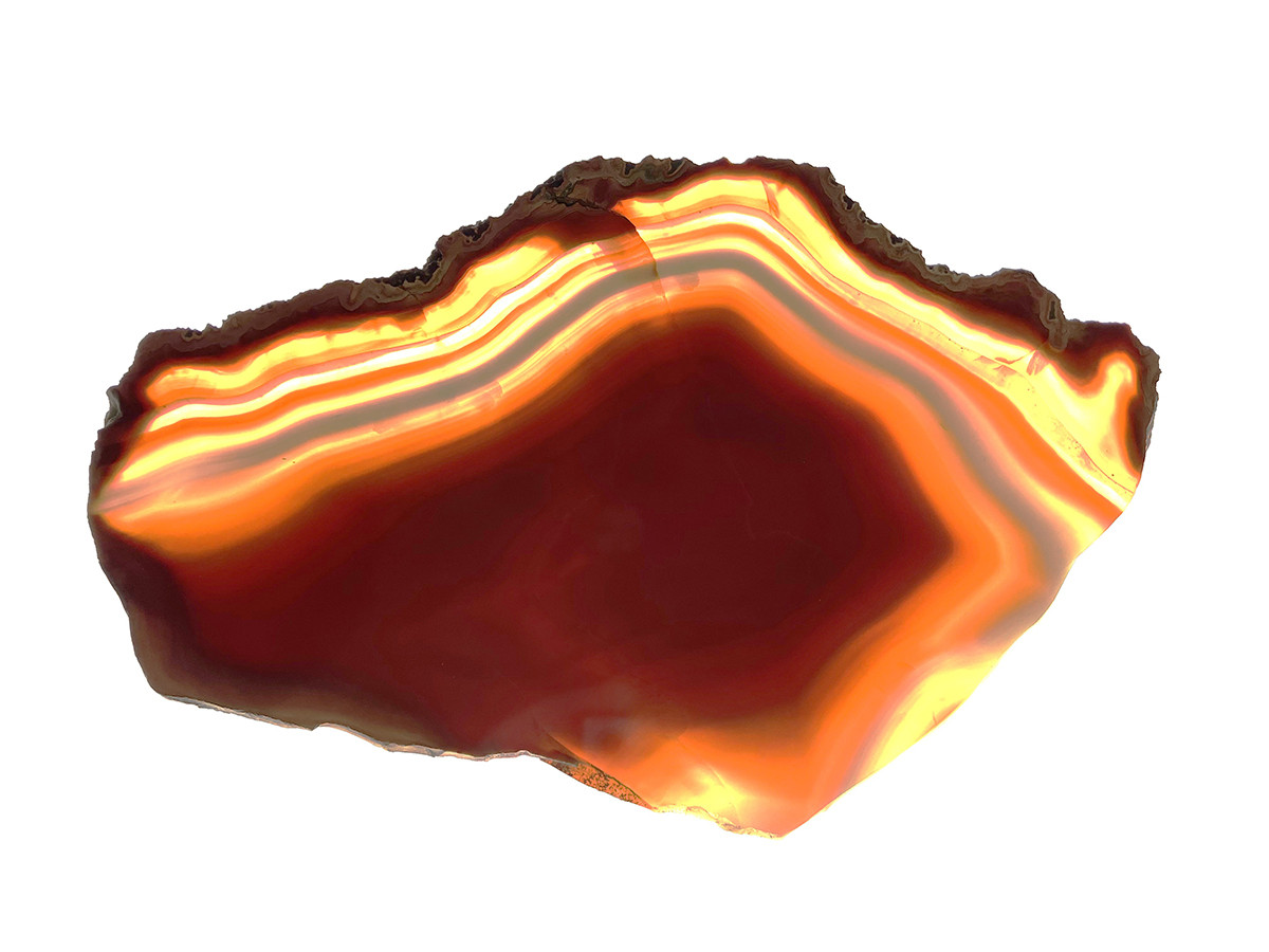 赤茶色と白の縞模様が美しい標本です。この他にも様々な色合いを持ち、宝飾品として世界中で使われます。地学研究者の間では、分析のため岩石をすりつぶす「めのう乳鉢」としてお世話になっている大事な鉱物です。