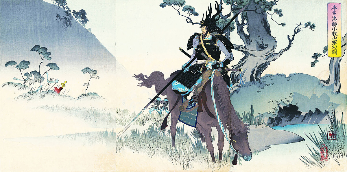 馬に跨っている人物は、徳川家康の重臣として「徳川四天王」のひとりに挙げられている戦国武将・本多忠勝です。1584年(天正12年)、徳川・織田連合軍と豊臣軍が対峙した「小牧・長久手の戦い」において留守を任されていた本多忠勝でしたが、圧倒的な兵力を持つ豊臣軍の前に、徳川軍が苦戦を強いられている状況を知ると、たった500名の兵を引き連れて駆け付けました。本浮世絵では、その際に本多忠勝が竜泉寺川(現在の愛知県岡崎市)へ馬と共に単身で乗り込み、馬の口を洗わせ余裕のある姿を見せた場面が描かれています。本多忠勝の堂々たる態度を目の前にした豊臣軍は一気に戦意を喪失。その結果、同合戦は休戦となりましたが、豊臣秀吉は敵方であったにもかかわらず、本多忠勝のことを「東国一の勇士」と称して高く評価しました。