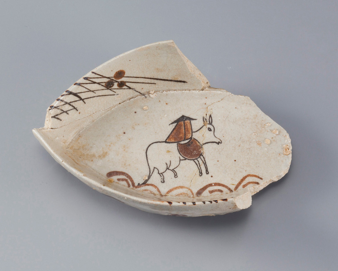美濃焼産地・岐阜県土岐市の窯ヶ根窯から出土した織部焼の向付です。器の見込みに馬あるいはロバに乗った人物が描かれます。中東や中国の陶磁器をルーツとするモチーフと考えられますが、織部に採り入れられ、こんなにユーモラスな絵文様になりました。