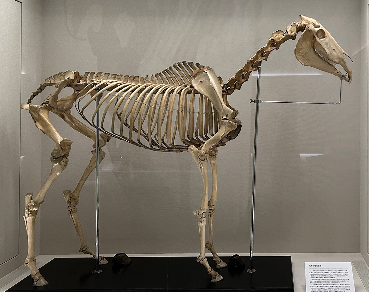 この馬は、日露戦争に際してロシアの将軍ステッセルより陸軍大将乃木希典に贈られた名馬「寿号」の子、「乃木号」です。乃木が学習院長であったことから学習院に贈られ、25年にわたり馬術教育に貢献してくれました。背骨が少し曲がっているのは、学生たちの愛を長年乗せ続けた結果なのです。昭和12(1937)年に死去した後に標本となり、令和の現在も常設展示室で学生たちに愛され続けています。