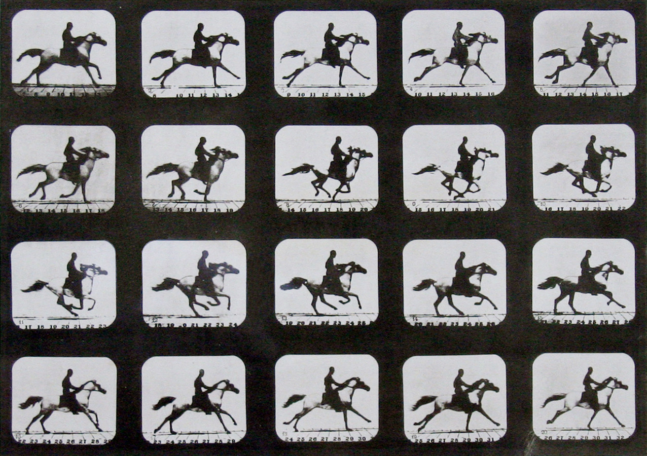 写真家イードウィアード・マイブリッジ(1830~1904)による馬の動態写真。マイブリッジは、元カリフォルニア州知事で競走馬の馬主であったリーランド・スタンフォードの依頼で、馬が走っている瞬間の足の様子を写真にとらえようと撮影実験を開始します。当時の感光材料は感度が低かったため、撮影は困難を極めました。複数台並べたカメラと連結した糸を張り、馬が走ると糸が切れてシャッターが下りる仕掛けを作ったり、明るいレンズを導入したり、電極でシャッターを下ろすなどの工夫を重ね、ついに走る馬の連続写真の撮影に成功します。肉眼では見えない動物の動態を捉えた写真の数々は、当時の人々に衝撃を与えました。