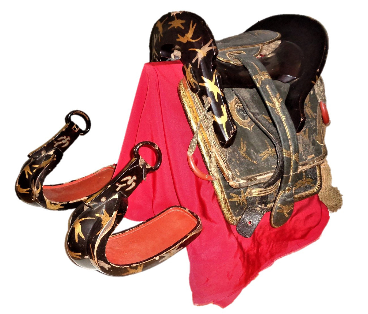 本資料は、戦陣用と思われる黒漆の馬具ですが、鞍橋(くらぼね)と鐙(あぶみ)に金蒔絵(まきえ)で蜻蛉紋を散らし、下鞍(したぐら)や力皮(ちからがわ)に金泥で蜻蛉を描いています。