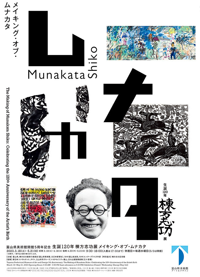 棟方の生誕120年を記念し、各地域の美術館(富山県美術館、青森県立美術館、東京国立近代美術館)が協力して開催する本展では、棟方と各地域の関わりを軸に、板画、倭画、油彩画といった様々な領域を横断しながら、本の装丁や挿絵、包装紙などのデザイン、映画・テレビ・ラジオ出演にいたるまで、時代特有の「メディア」を縦横無尽に駆け抜けた棟方の多岐にわたる活動を紹介し、棟方志功とはいかなる芸術家であったのかを再考します。