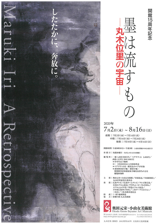 今回は「原爆の図丸木美術館」にご協力いただき、戦後の代表作である「原爆の図」シリーズのほか、関連作家の作品も交えながら、位里の初期から晩年までの代表作を含む約100点を一堂に展示いたします。「墨は流すもの」と語り、水墨表現の可能性を追求し続けた丸木位里の「宇宙」をどうぞご覧ください。