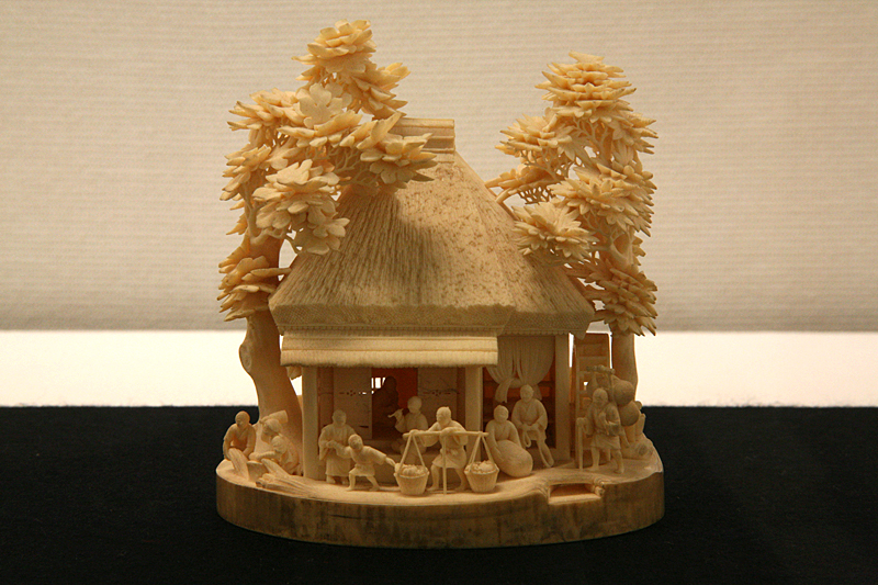 動物の牙を用いた細工物【牙彫(げちょう)】。家の中には囲炉裏の前に座った老人までいます!