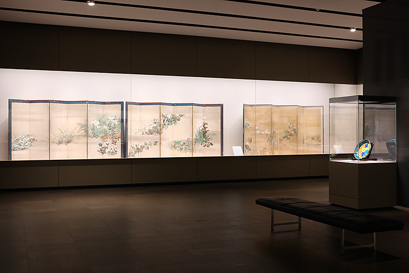 (左から)《四季草花図屛風》喜多川相説筆 / 《草花図屛風》伊年印 / 《色絵葡萄文大平鉢》