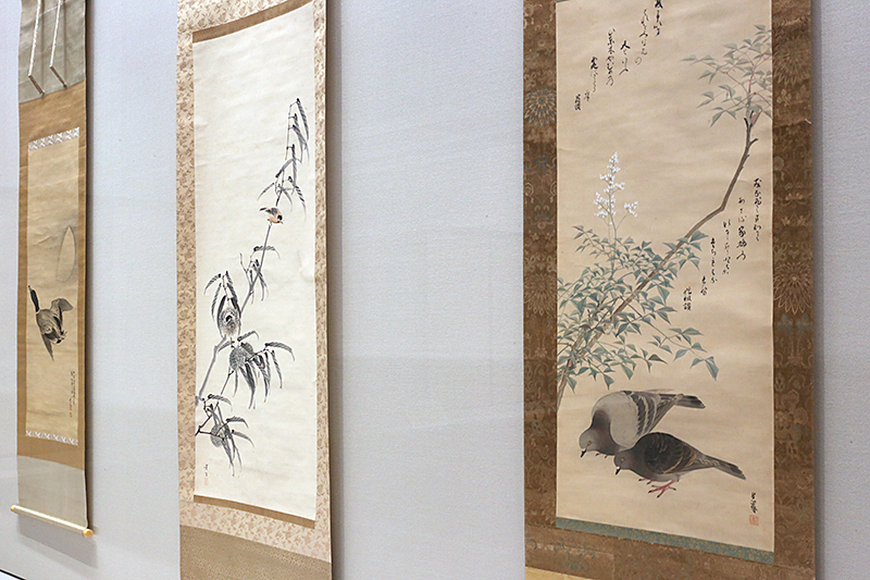 (右から)《南天双鳩図》呉春筆 日野資枝・烏丸光祖賛 / 《栗小禽図》松村景文筆 / 《寒月飛鴨図》松村景文筆