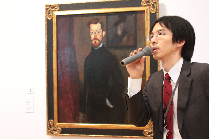 《ポール・アレクサンデル博士の肖像》の前で解説する担当学芸員の島本英明さん