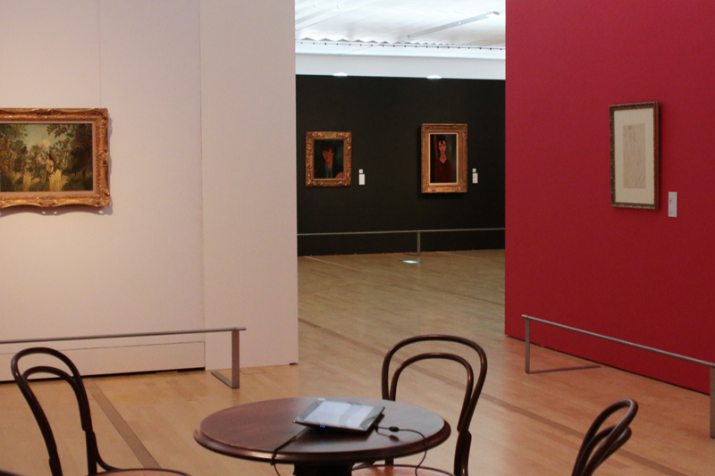 カフェ風のコーナーではタッチパネル端末で「つながりモディリアーニ~年代から見る交友関係~」を見ることができる