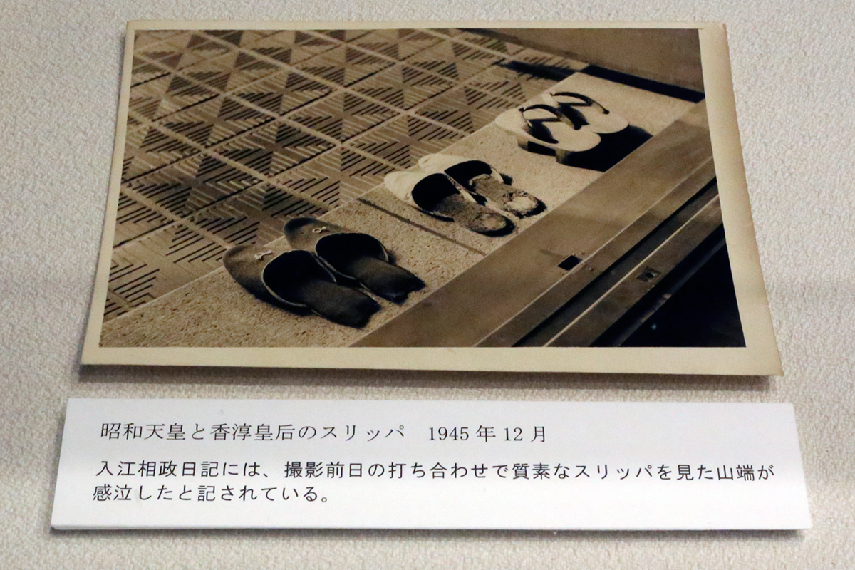 撮影前の打合せに訪れた山端祥玉が見て感泣したという、昭和天皇と香淳皇后のスリッパ。1945年12月