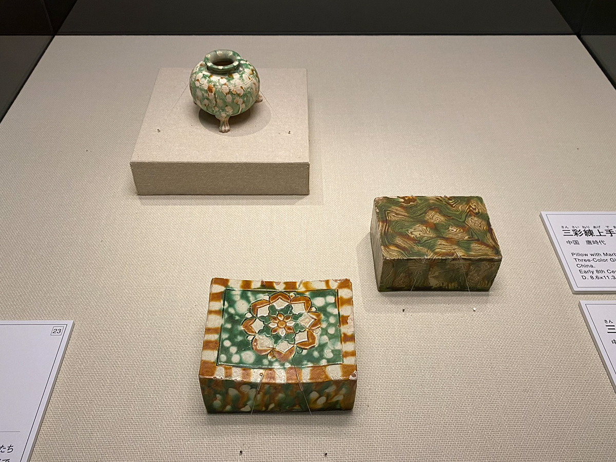 (上から時計回りで)《三彩鍑》中国・唐時代 / 《三彩練上手枕》中国・唐時代 / 《三彩宝相華文枕》中国・唐時代