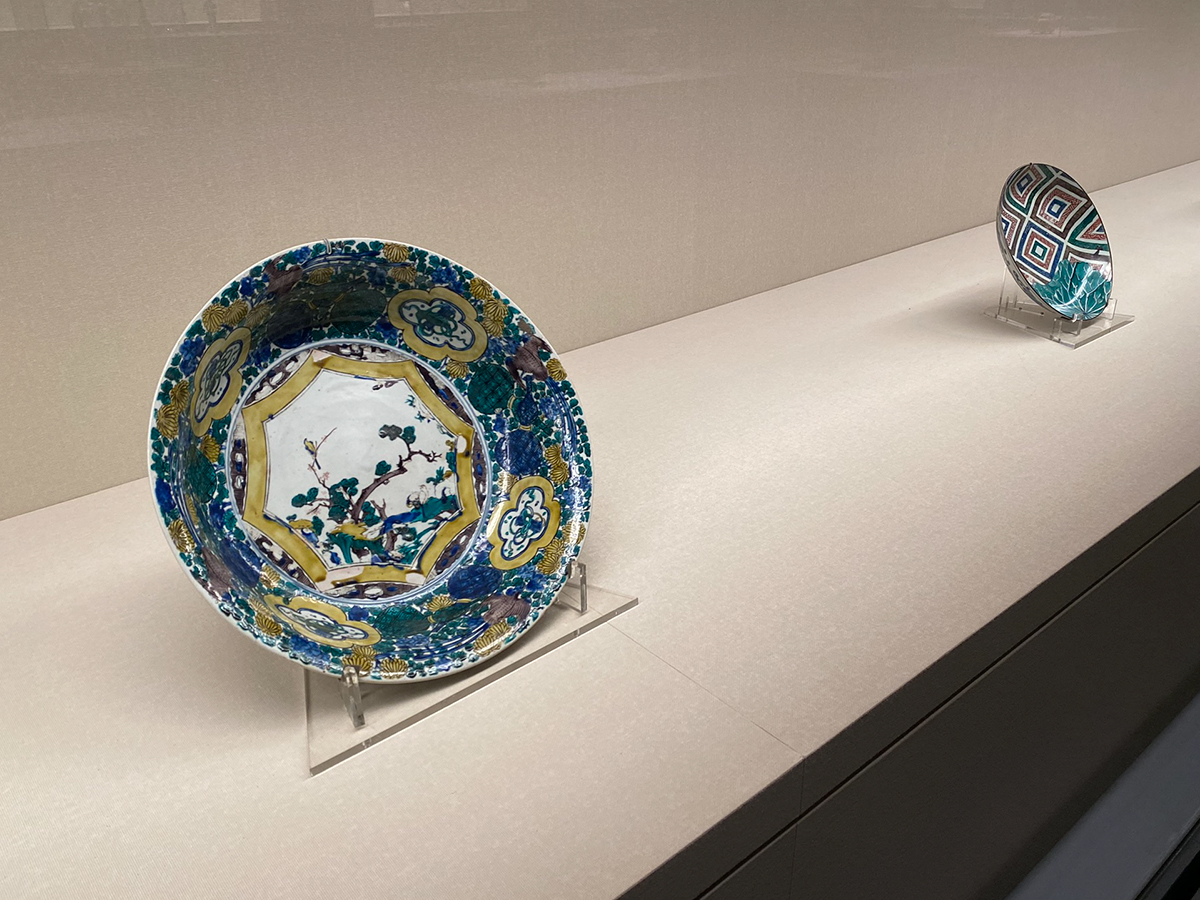 (左から)《色絵花鳥文大皿》古九谷 江戸時代前期 / 《色絵蓮葉に菱文大皿》古九谷 江戸時代前期