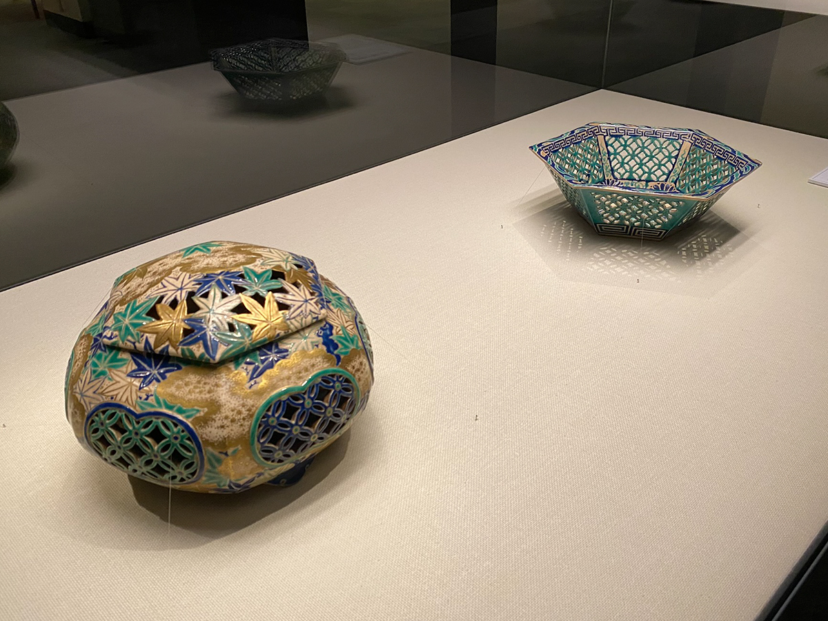 (左から)《色絵楓文透彫手焙》古清水 江戸時代中期 / 《色絵菊花文透彫六角鉢》古清水 江戸時代中期