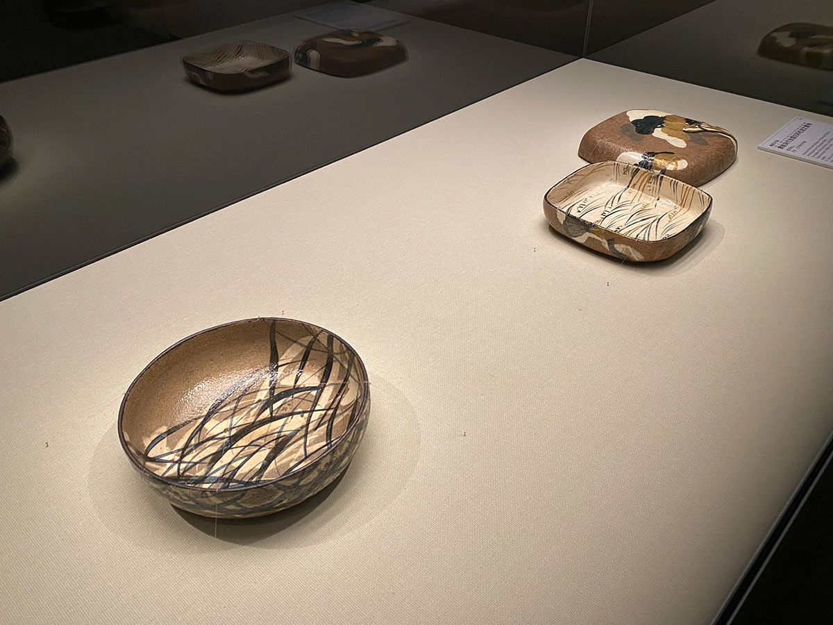 (左から)《銹絵染付白彩薄蝶文平鉢》尾形乾山 江戸時代中期 / 重要文化財《銹絵染付金銀白彩松波文蓋物》尾形乾山 江戸時代中期