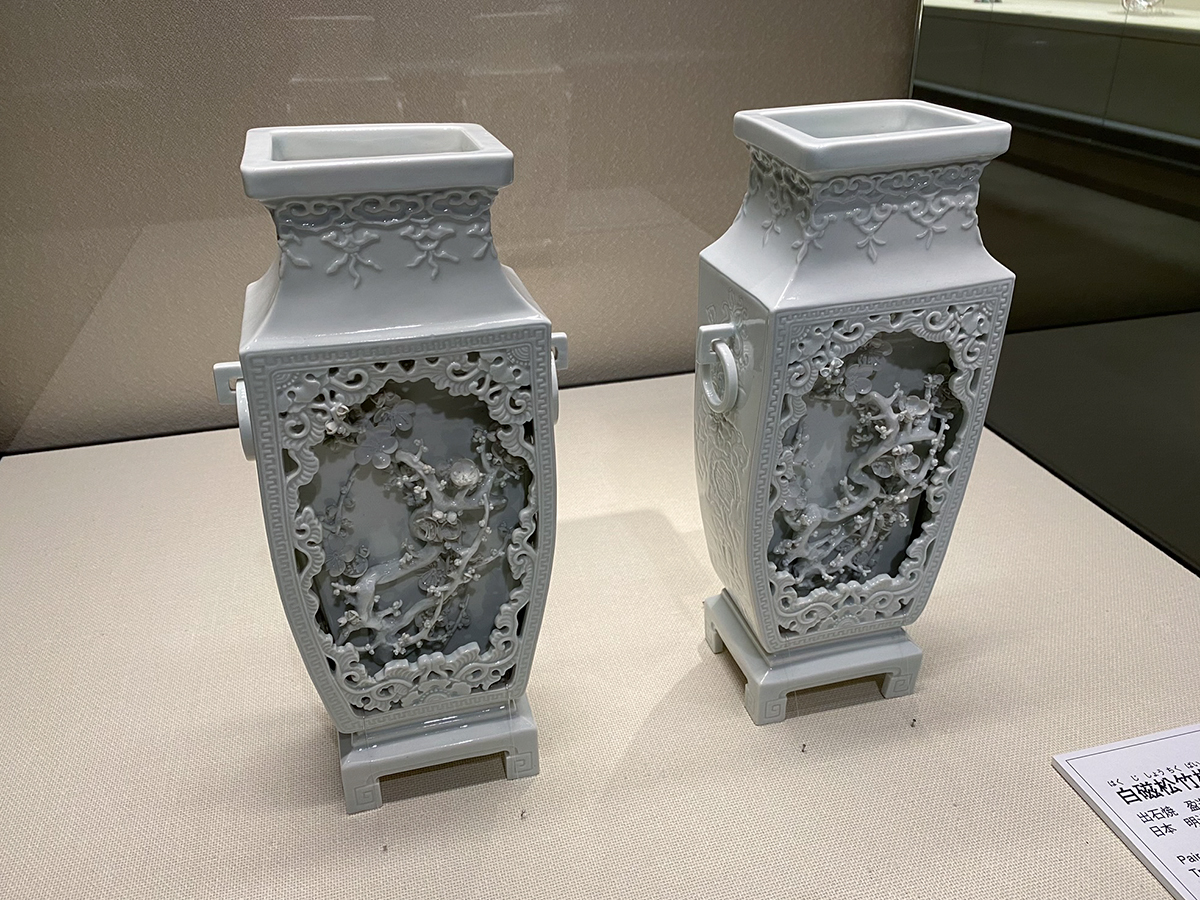 《白磁松竹梅文遊環付方瓶》一対 出石焼 盈進舎 明治時代