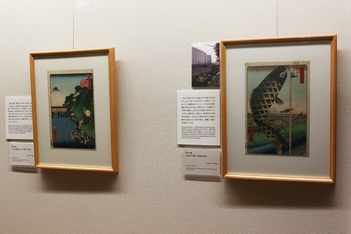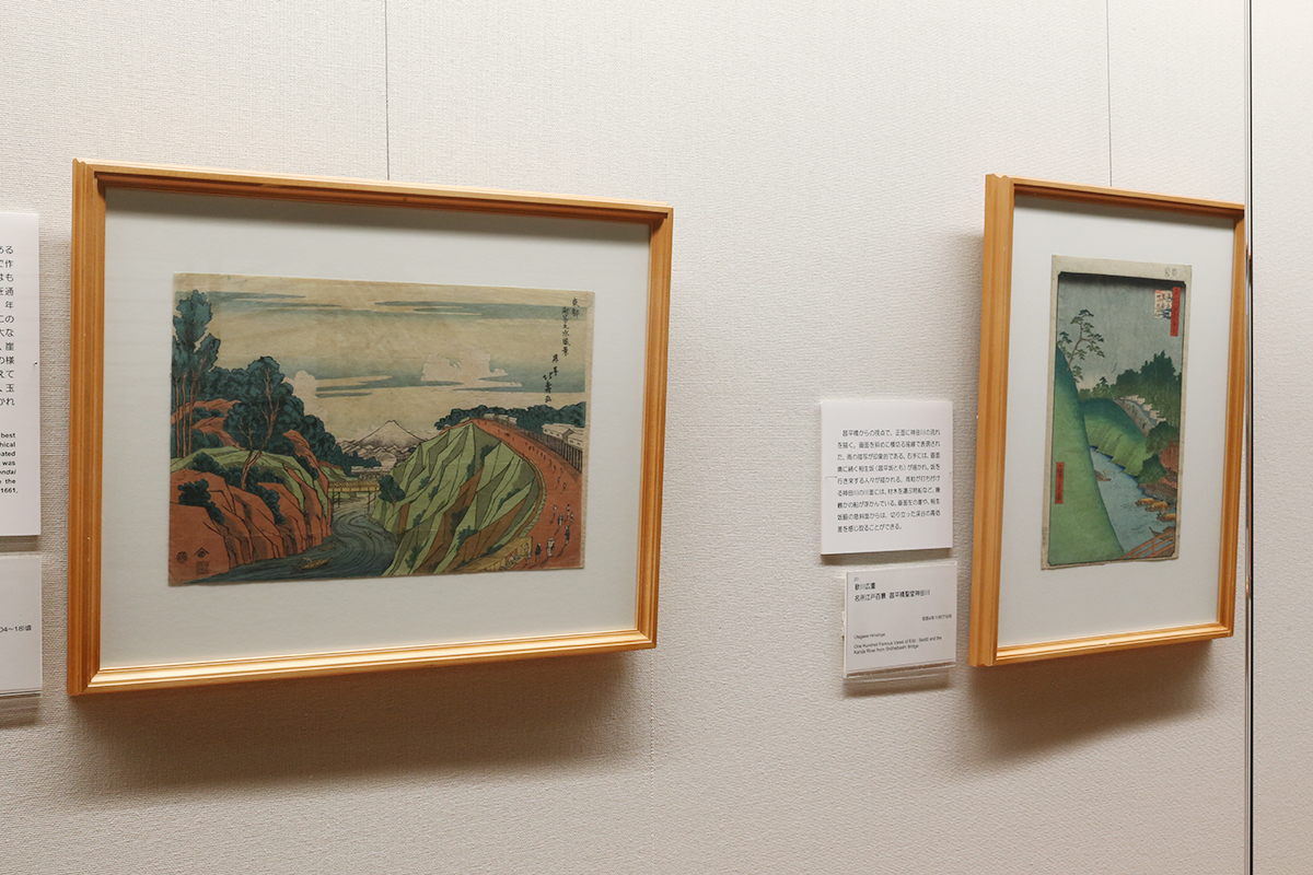 (左から)歌川広景《江戸名所道戯尽 四 御茶の水の釣人》 / 歌川広重《名所江戸百景 水道橋 駿河台》