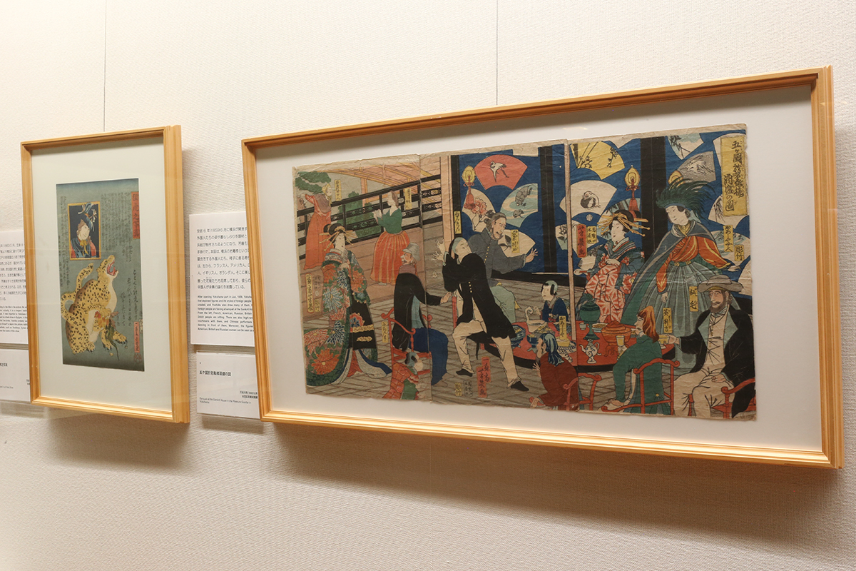 (左から)落合芳幾《猛虎之写真》万延元年(1860)7月 / 落合芳幾《五カ国於岩亀桜酒盛の図》万延元年(1860)12月