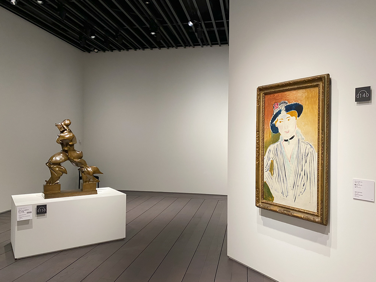 (左から)ウンベルト・ボッチョーニ《空間における連続性の唯一の形態》1913年(1972年鋳造) / アンリ・マティス《縞ジャケット》1914年