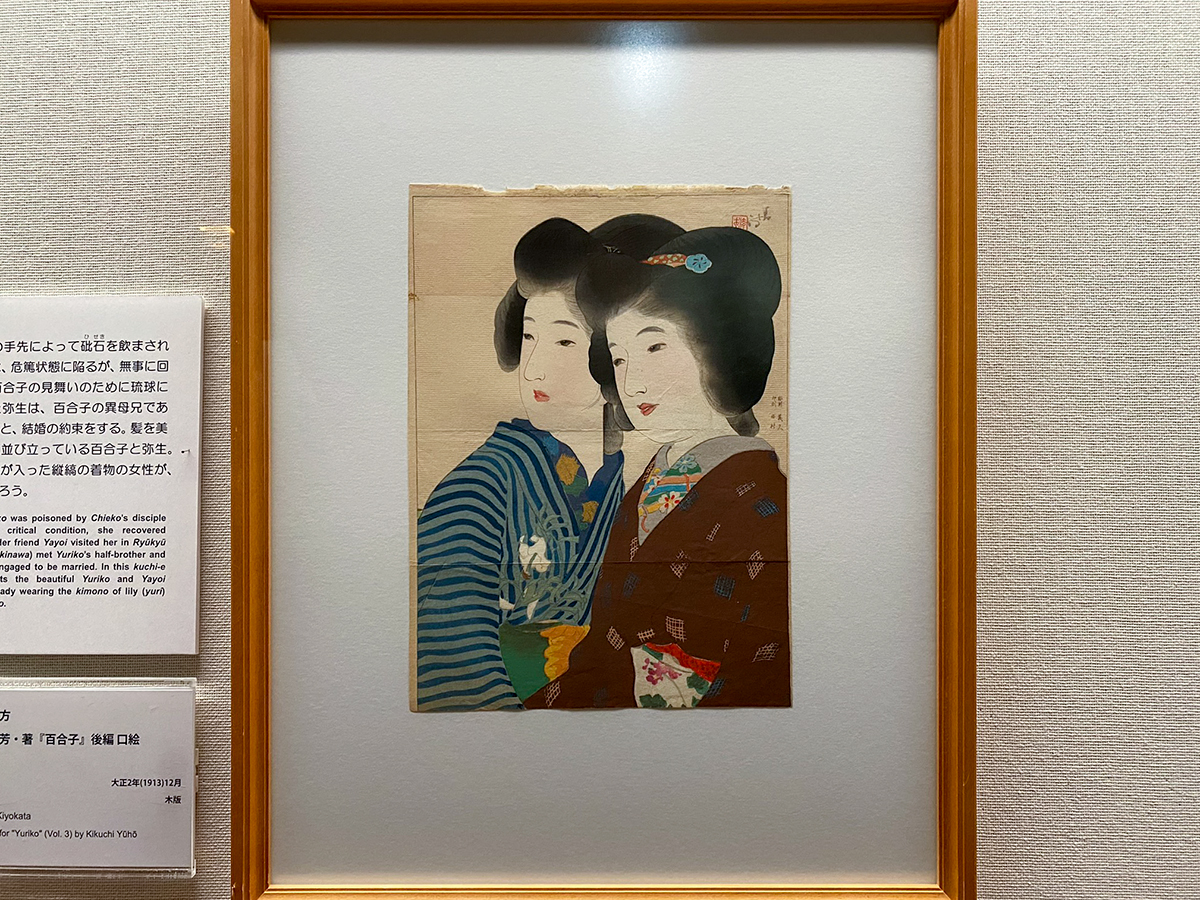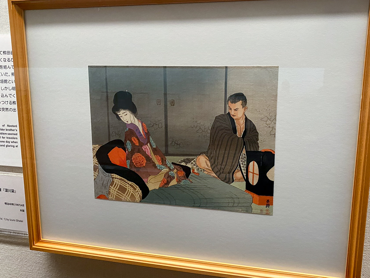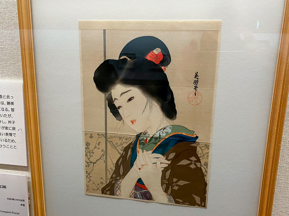 内容は基本的には小説の一場面。当時は、封建的な家庭の中での恋愛を描いた「家庭小説」が主流だったため、木版口絵も多くは美人画でした。書籍の売り上げを左右するほど人気があったため、出版社はこぞって、実力のある絵師に口絵を依頼しました。
