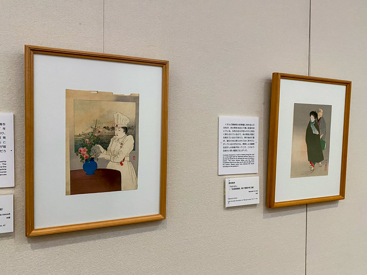 (左から)武内桂舟 「看護婦」(『文芸倶楽部』第10巻第6号口絵) 明治37年(1904) / 武内桂舟 「ちらちら」(『文芸倶楽部』第17巻第3号口絵) 明治44年(1911)